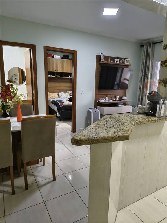 1 dormitório com armário embutido, banheiro social, cozinha, área de serviço, sala (sai a mesa e cadeiras), fica mobiliado. Vaga na garagem, todas livres. Prédio frente do mar, com elevador. Vende somente à vista. Condominio R$558,00 porque tem taxa extra de R$150,00 mensal para reforma do térreo, até julho/2026. Após cai para R$408,00