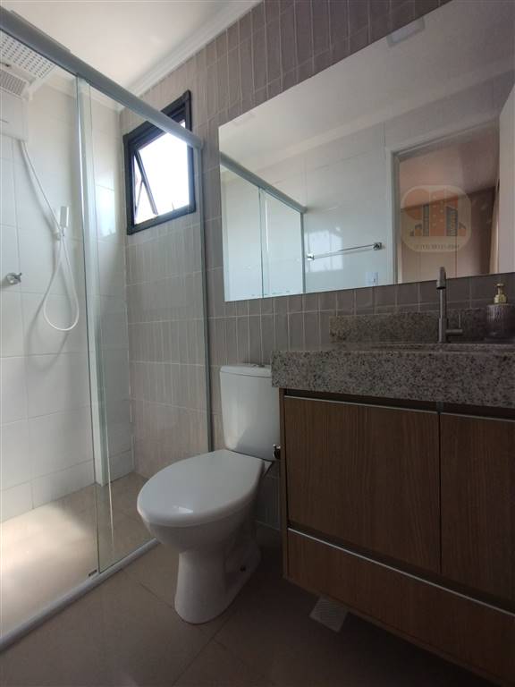 Banheiros com box de vidro, pia de granito, gabinete, espelho, chuveiro